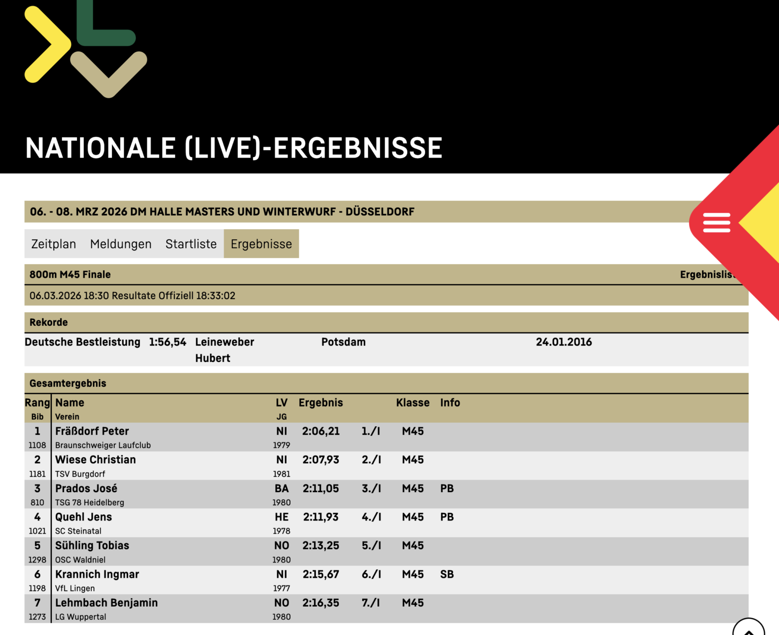 Die Plätze 1 und 2 gingen mit Peter Fräßdorf vom Braunschweiger LC und Christian Wiese vom TSV Burgdorf nach Niedersachsen, die damit auch beide jeweils auf 1 und 2 der Deutschen Bestenliste Halle 2026 in der M45 stehen.