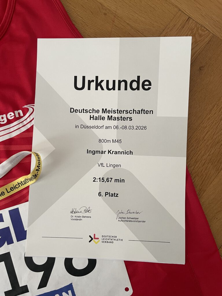 Wie auch schon 2025 versuchte sich Ingmar während der Wintermonate für die DM Halle der Altersklassen zu qualifizieren. Geplant waren 2 Wettkämpfe jeweils im Januar und Februar, um die Norm zu knacken. Zum Glück klappte das schon Ende Januar bei den offenen FLVW-Meisterschaften in Dortmund. Zwar nur hauchdünn um 14 Hundertstel, aber Hauptsache dabei. Die offenen Landesmeisterschaften Nordrhein im Februar waren dann „nur noch” ein guter Formtest und Generalprobe für die ebenfalls in Düsseldorf stattfindende DM.