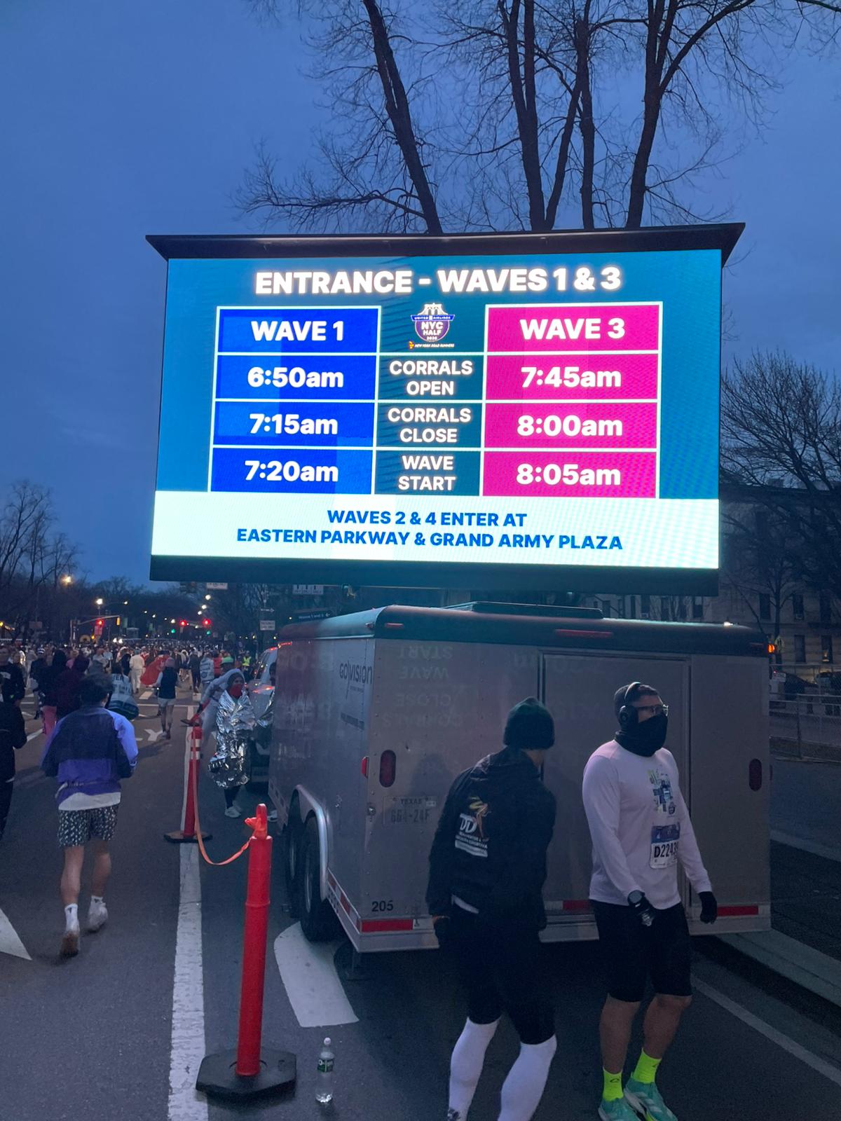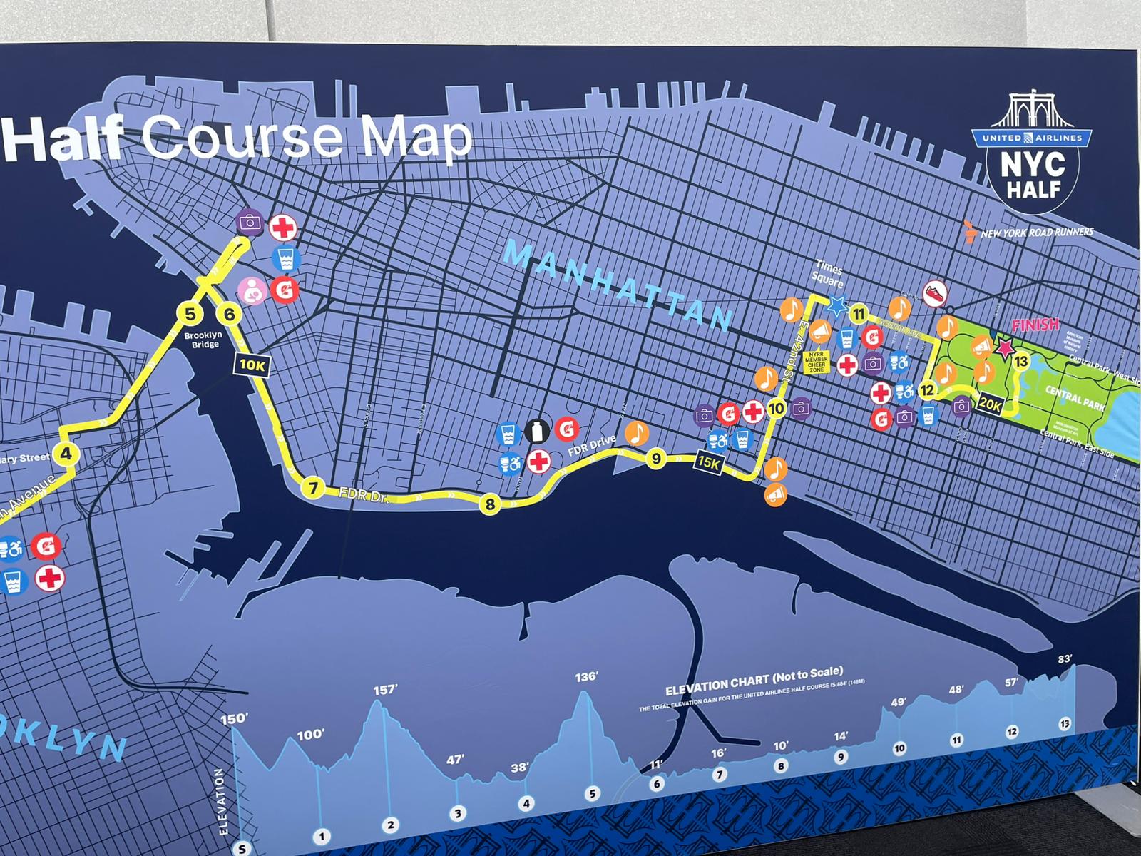 Der Halbmarathon am Sonntag, den 15. März, startete früh: Die Startzeiten lagen zwischen 7:20 Uhr und 8:30 Uhr. Bei eisigen Temperaturen und kaltem Wind ging es los – gestartet wurde in Brooklyn, dann über die legendäre Brooklyn Bridge, am East River entlang, über den Times Square und schließlich zum Zieleinlauf im Central Park. Gänsehaut!
